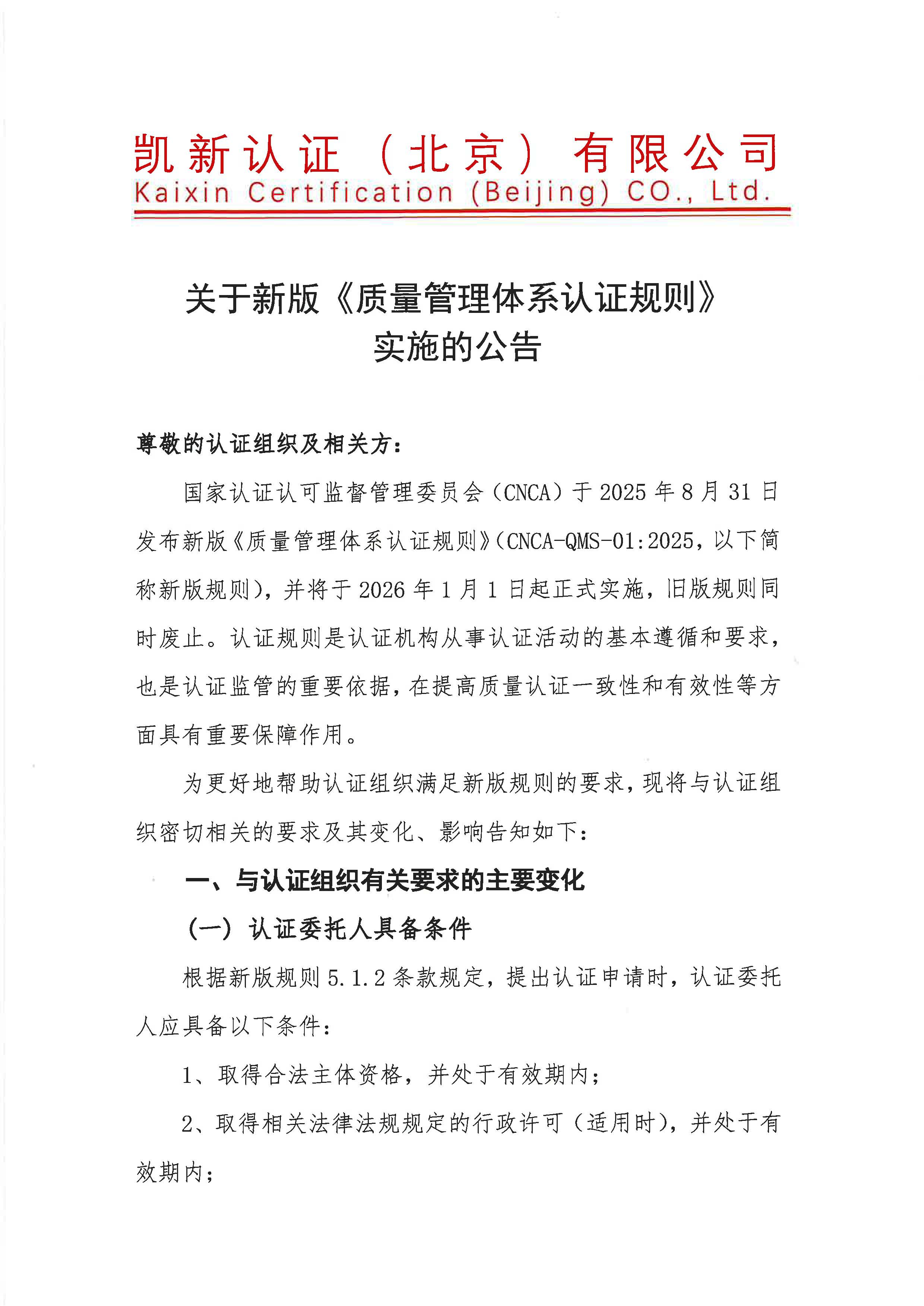 國家認證認可監督管理委員會(CNCA)于2025年8月31日發布新版《質量管理體系認證規則》(CNCA-QMS-01:2025,以下簡稱新版規則),并將于2026年1月1日起正式實施,舊版規則同時廢止。認證規則是認證機構從事認證活動的基本遵循和要求,也是認證監管的重要依據,在提高質量認證一致性和有效性等方面具有重要保障作用。112025-11